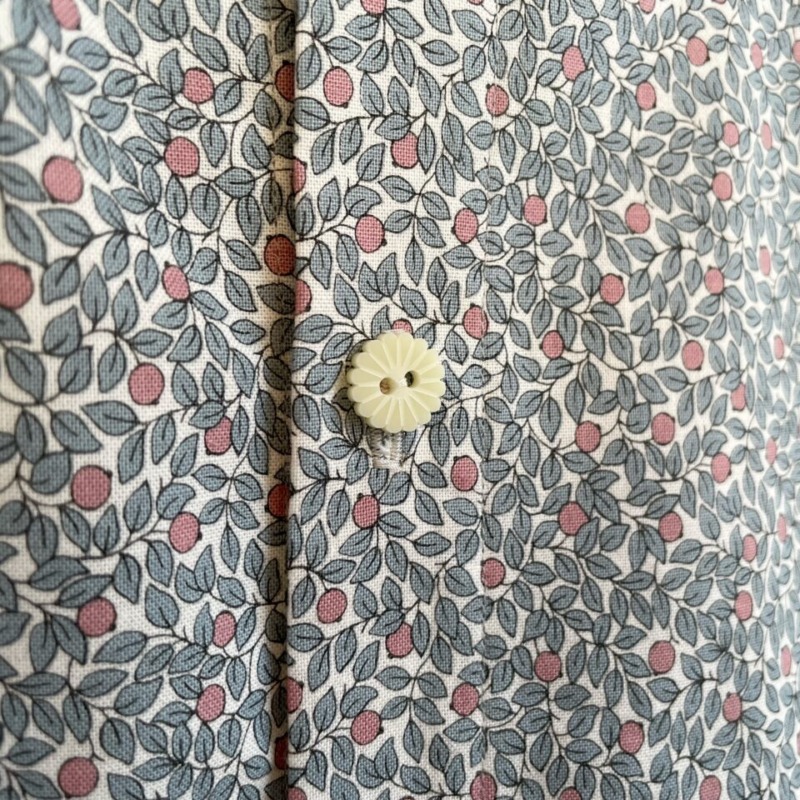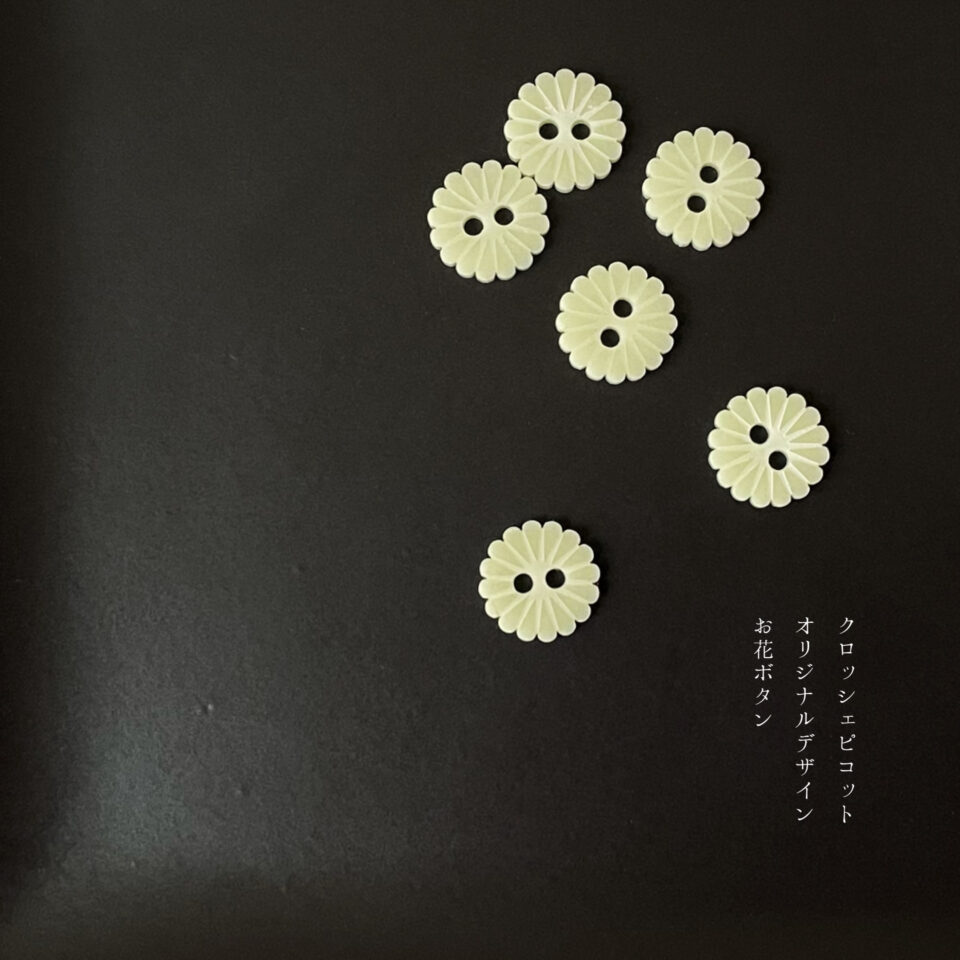 ボタンはクロッシェピコットオリジナルデザイン。マットなアイボリーのお花がひっそりかわいく咲いてくれます。リバティの美しいプリントを邪魔することなく、小さく輝く存在感。