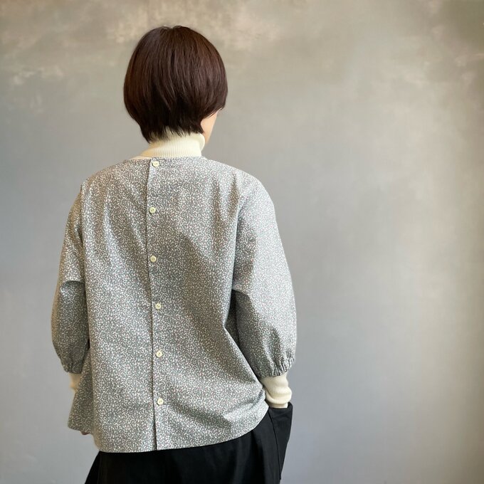ラセンビィ・コットンはやや厚手で透け感がほとんどない30スクエアのシーチング素材です。実際に手にすると確かにやや厚手。タナローンより身近でラフな感じがするリバティです。普段の生活に気兼ねなく取り入れていただけそうです。柄の発色はタナローンと変わらず美しいので、いつもの日常に少しだけ華やかさをプラスしたい時に選んでいただきたいブラウスです。