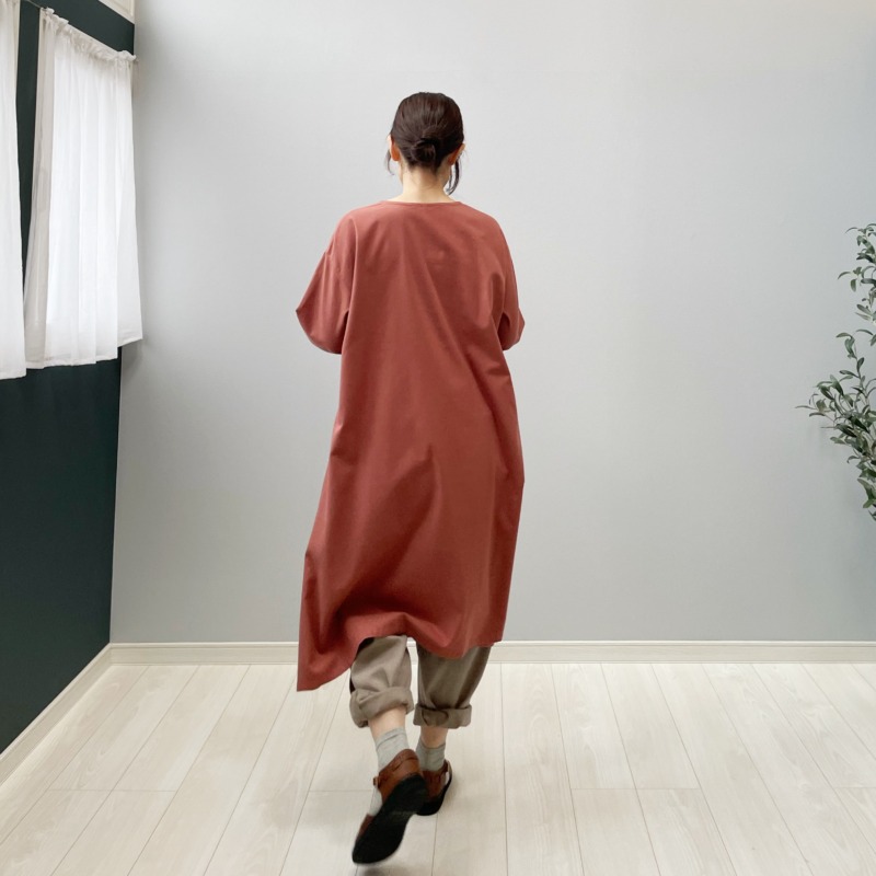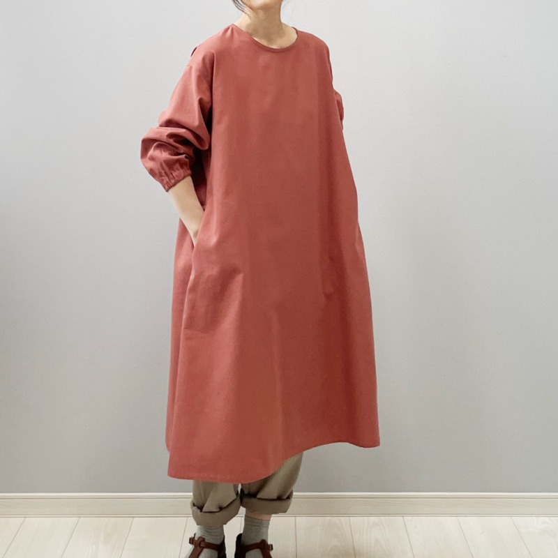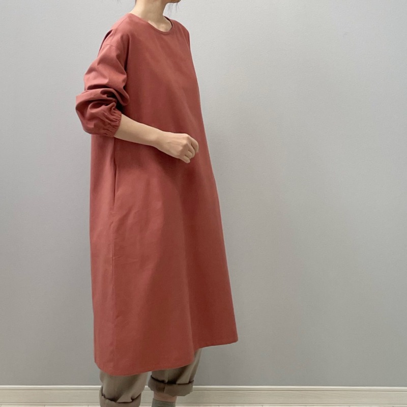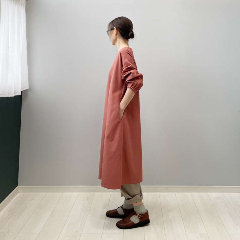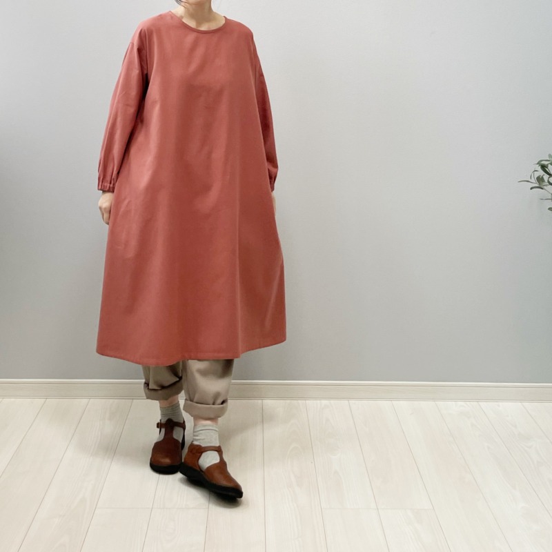 ピンコッタ色の起毛コットンワンピース、着用画像を撮影しました & サンドベージュの新作パンツもご紹介。