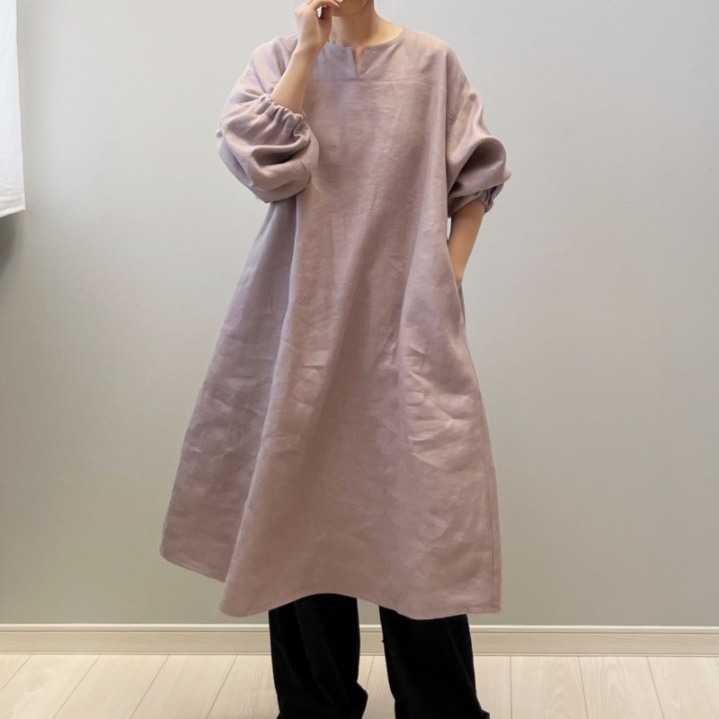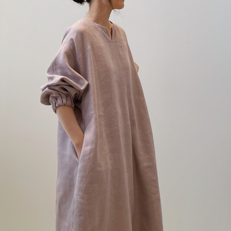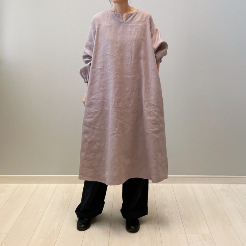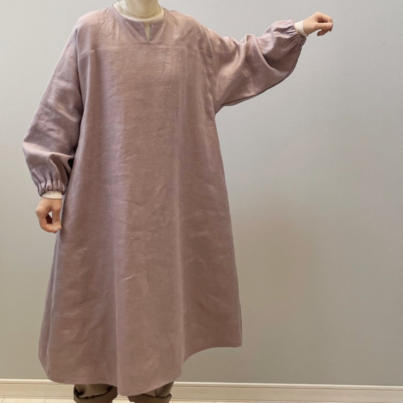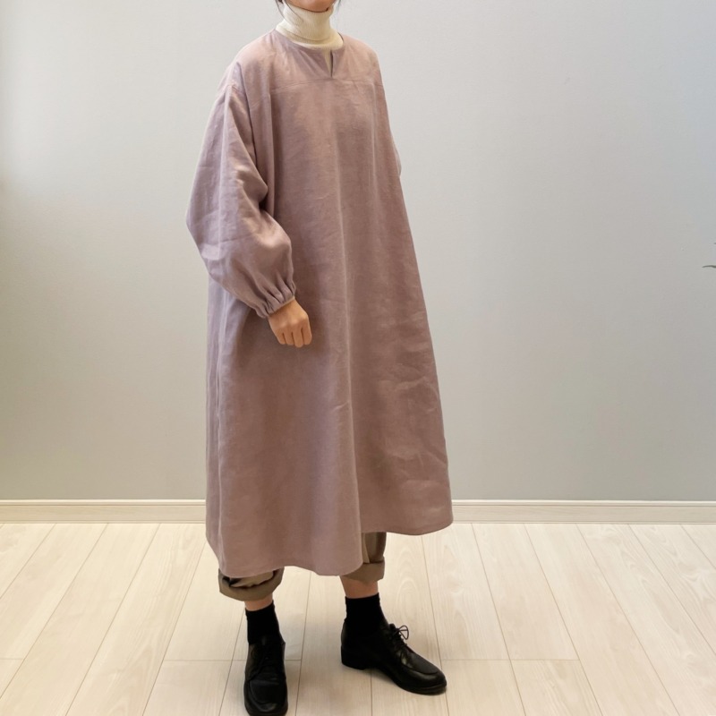 リネンのしなやかな光沢とナチュラルなシワ感に起毛のぬくもりが重なり、寒い冬にそっと寄り添ってくれるやさしいワンピースに仕上がっています。