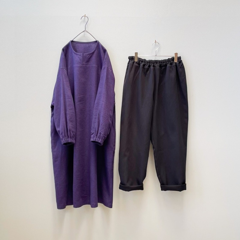 スミレ色のひよりのワンピースと綿ウールのアンダードレスパンツ(ダークグレー)をセットにして、