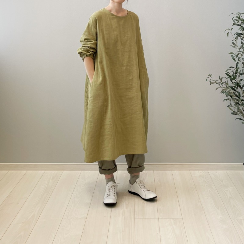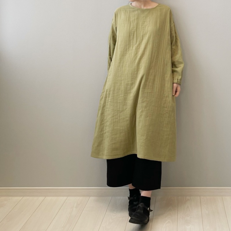 ダブルガーゼのワンピースは軽いから。私は冬に重ね着して着るのが好きなんですけど、雪かきして大汗かいた後にも活躍してくれるんですよ。