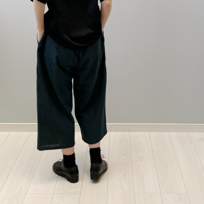 中に穿いているのは 綿麻 千鳥格子 ブルーのレイヤードパンツ。