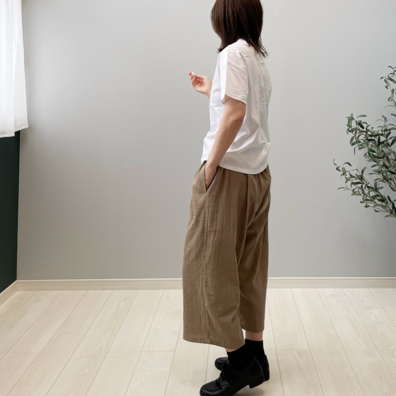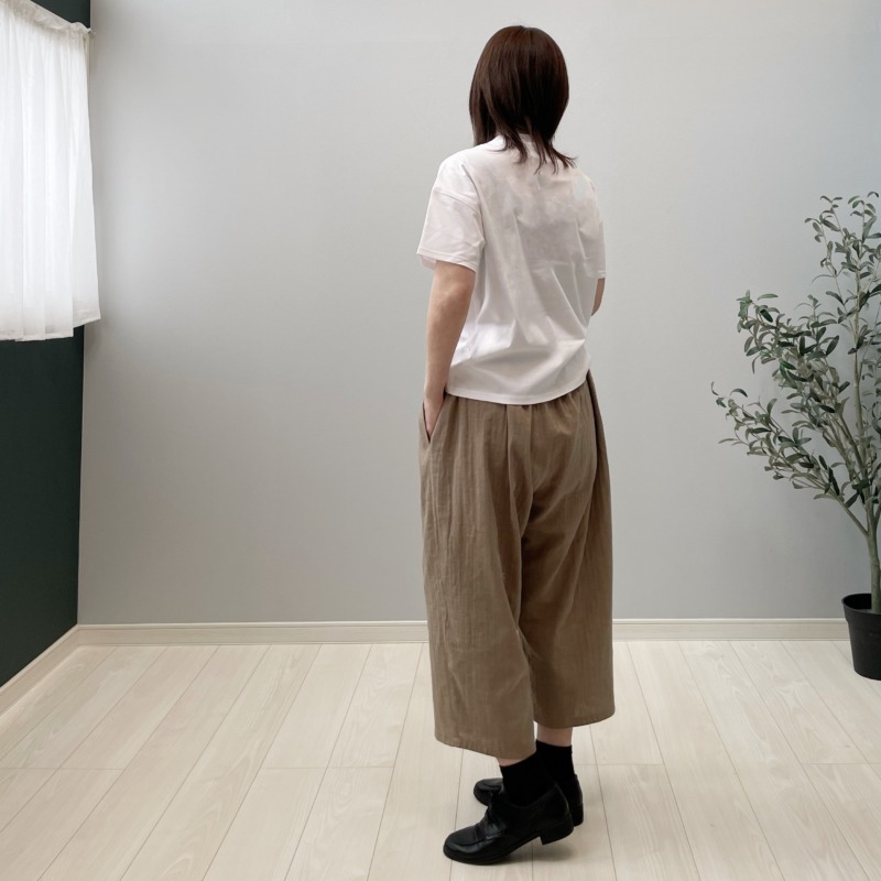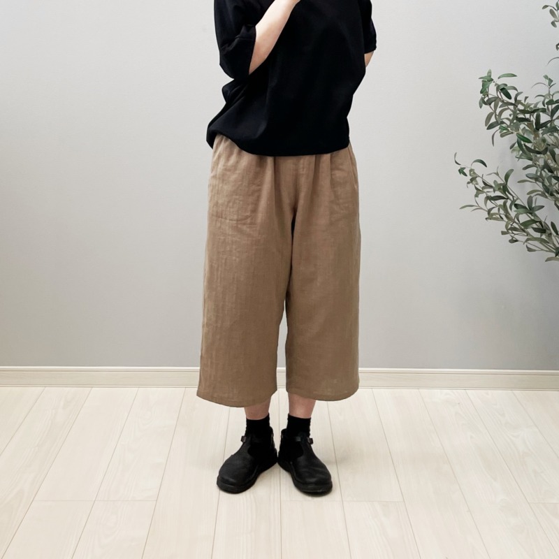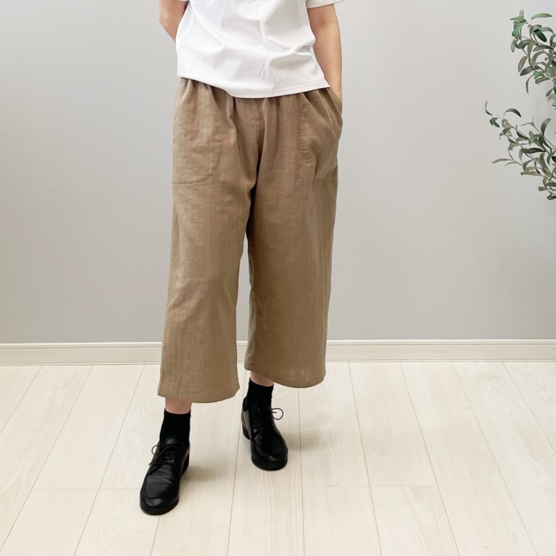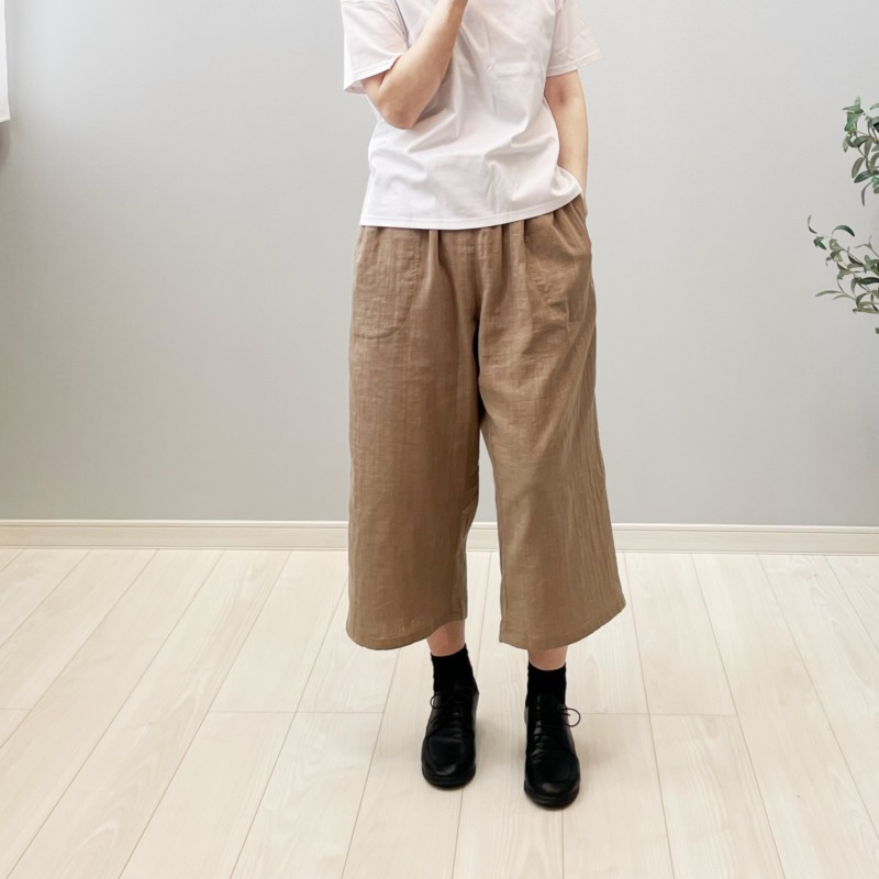 本日紹介するのはダブルガーゼの半端丈ワイドパンツ。