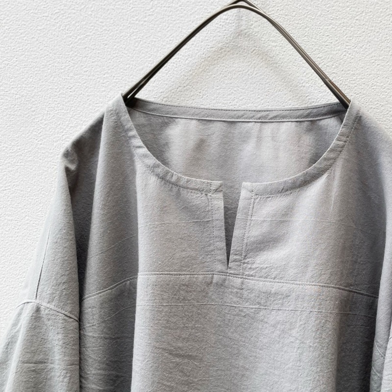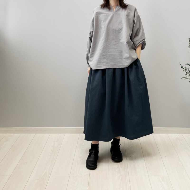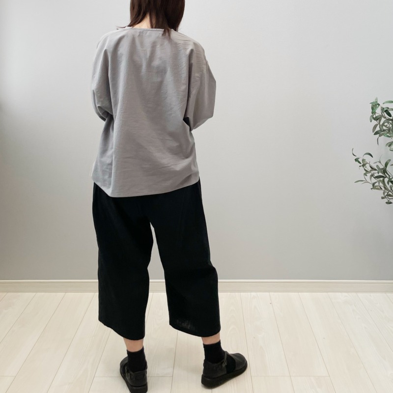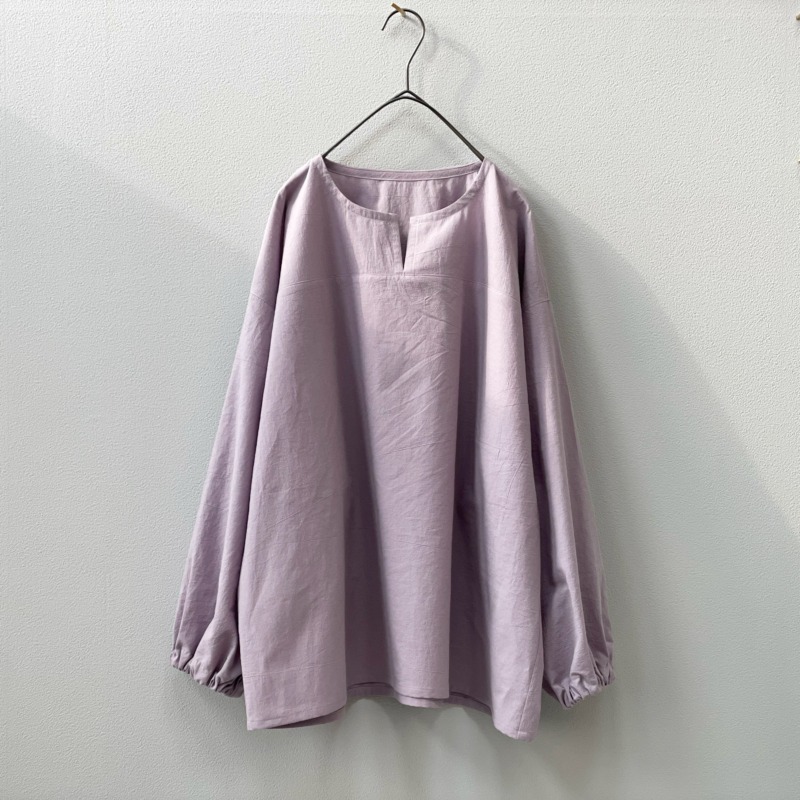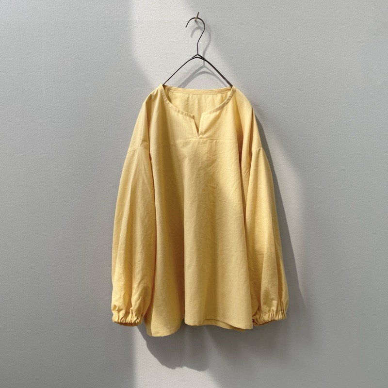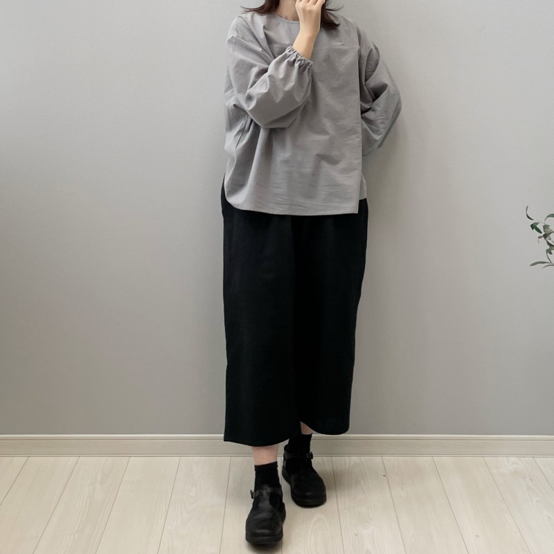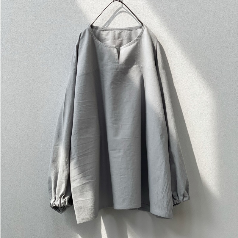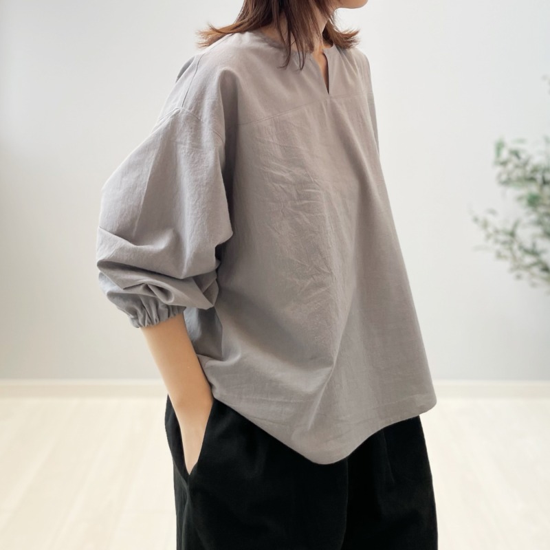 ゆったりとした身幅にすっきりとした首元。ふんわりと丸みを持たせた袖が動きに表情を生み、シンプルで静かな印象を残します。