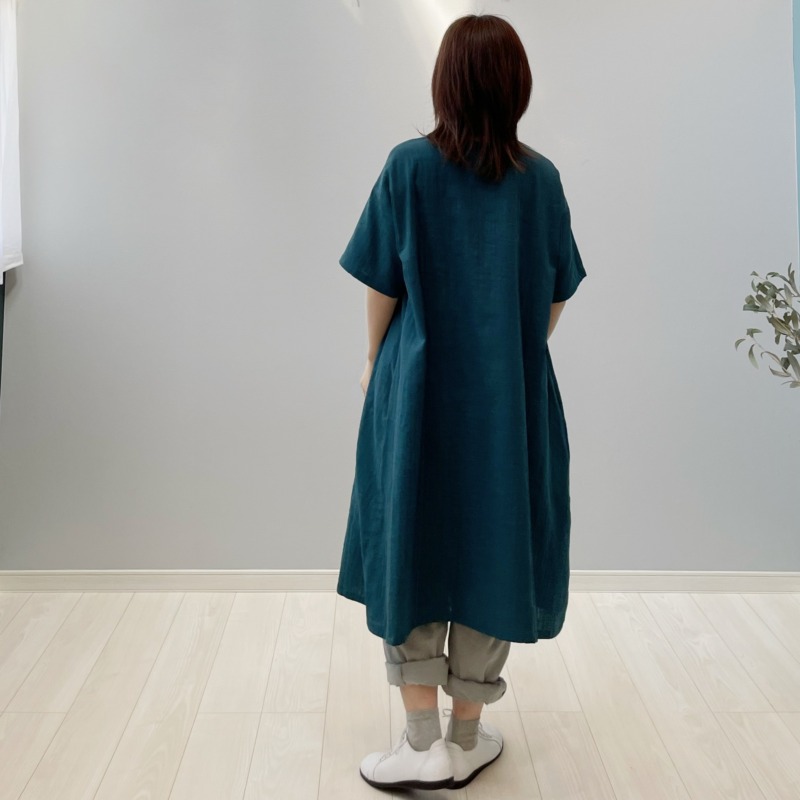 ブルーグリーンのワンピースと重ねれば深みのある落ち着いた印象に。