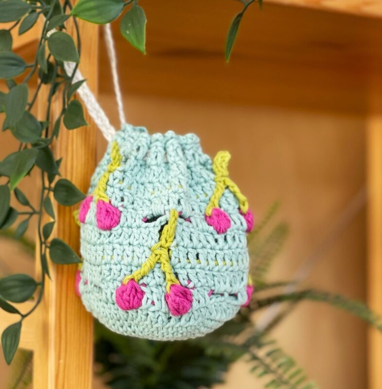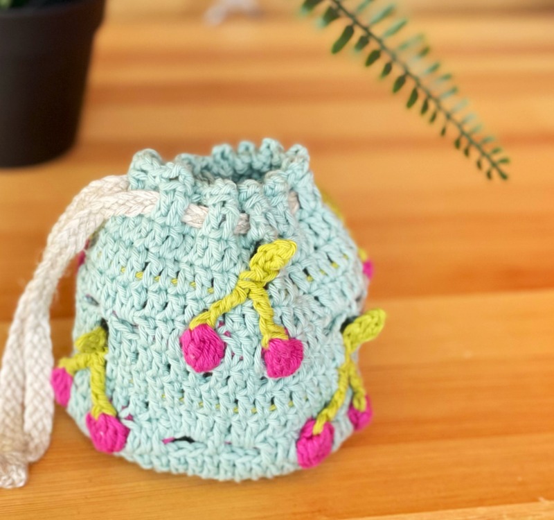 そんでもって、かぎ針でさくらんぼの巾着を編んだので見てほしい。