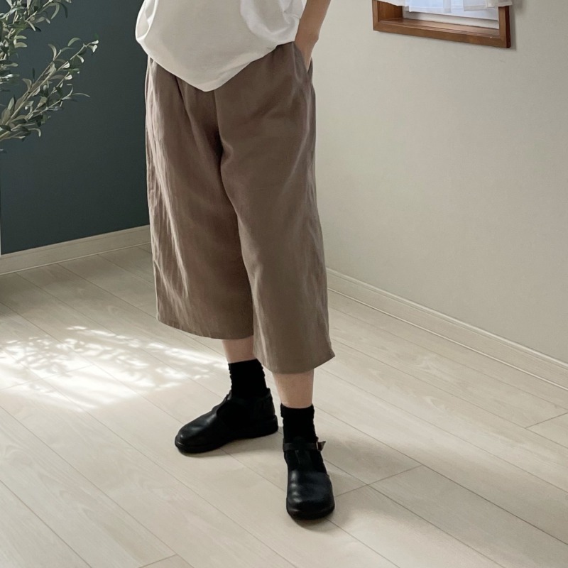 フォーンブラウンのダブルガーゼで作った半端丈のワイドパンツ。