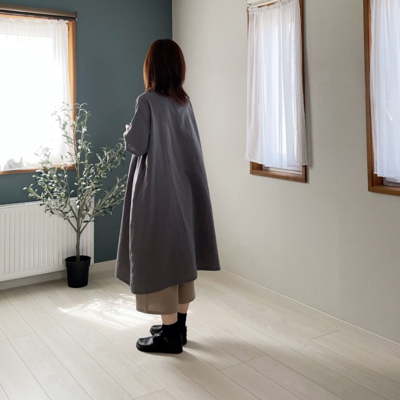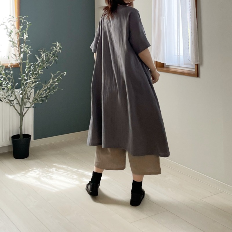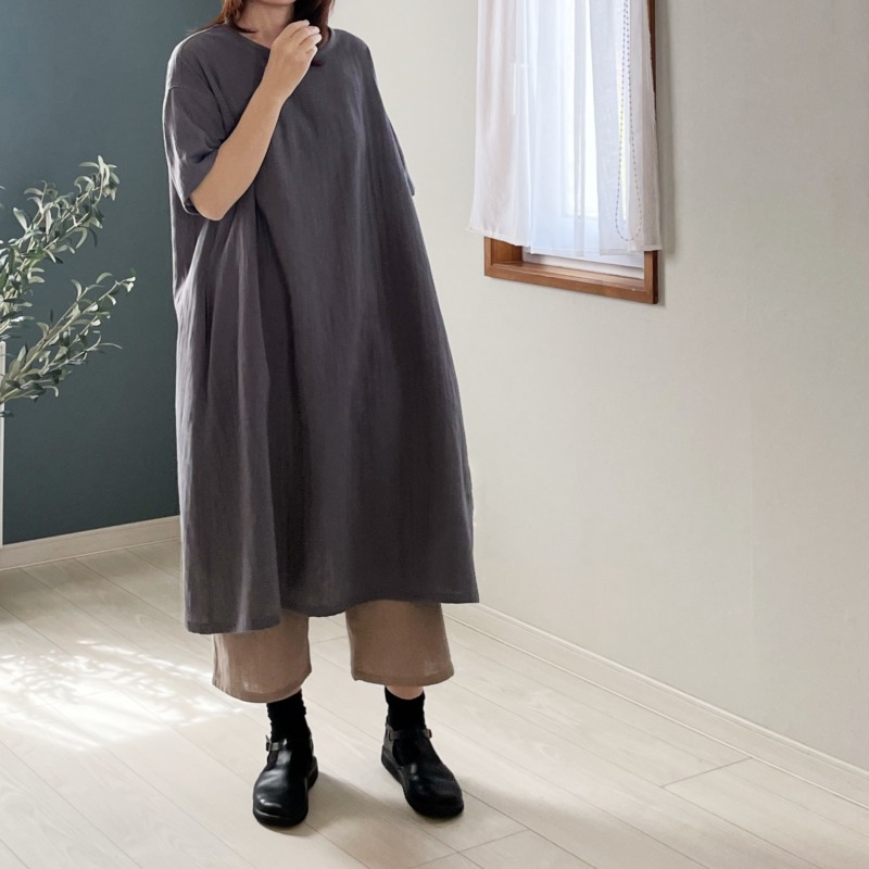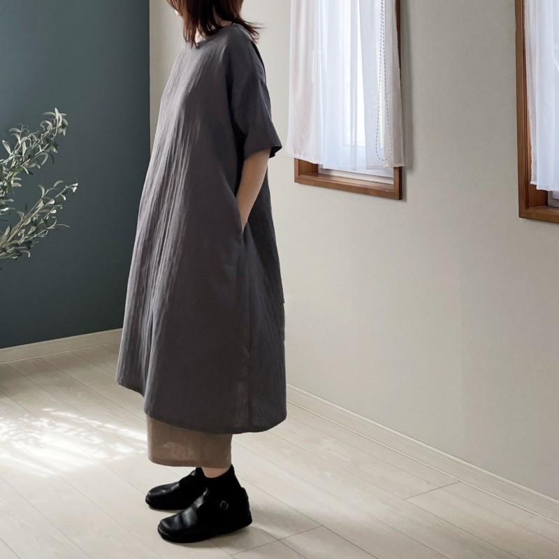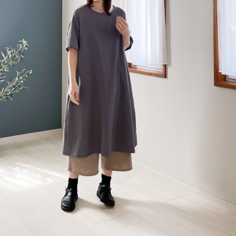 ミネラルグレイのダブルガーゼ。半袖ワンピースの着用画像。