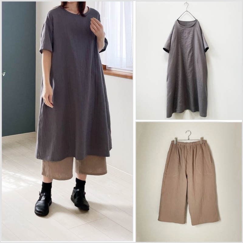 ラテカラーダブルガーゼのワンピースとパンツ。販売開始しました。お得なセット販売もあります。